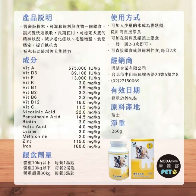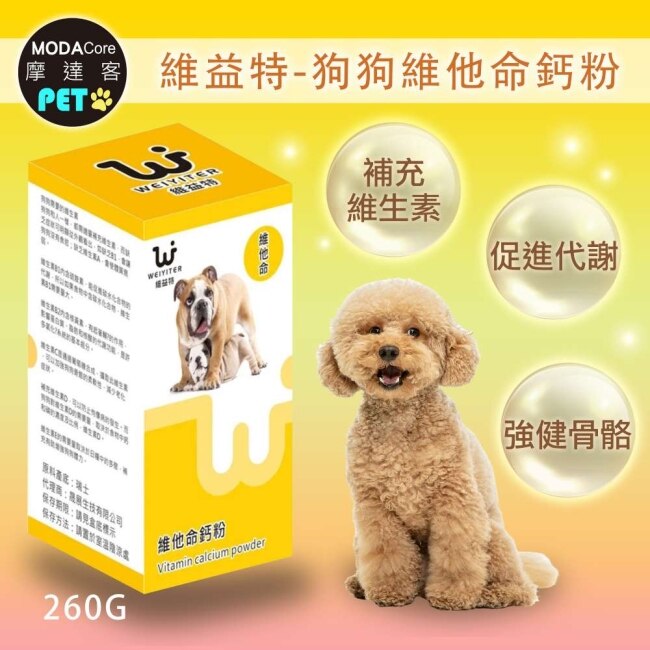 維益特狗狗維他命鈣粉為瑞士原料之醫療級營養補充品,專為犬隻設計,兼具補鈣與多元維生素,強健骨骼、促進代謝、提升抵抗力,適合各年齡層狗狗日常保健與術後恢復使用。