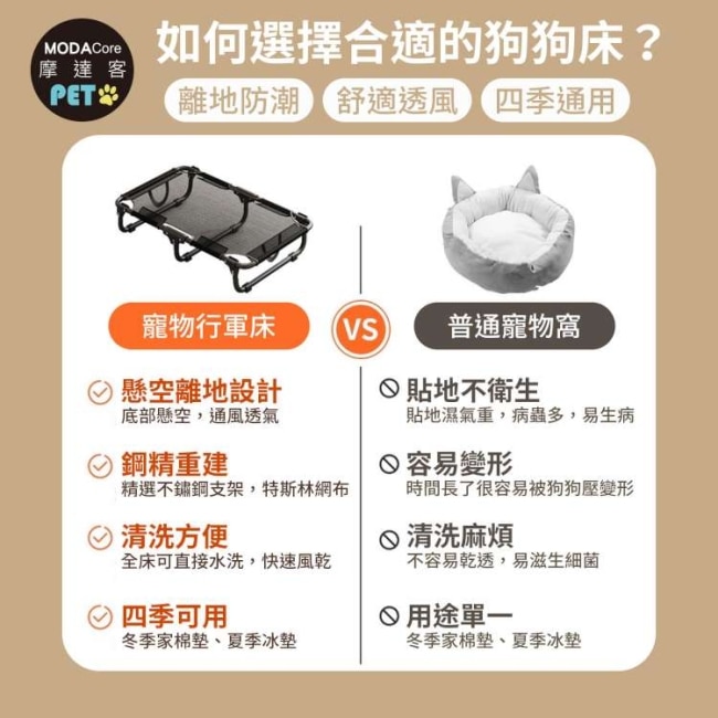 採用穩固透氣的高架設計,有效讓毛孩遠離地面濕氣與灰塵,保持臥墊乾爽舒適。