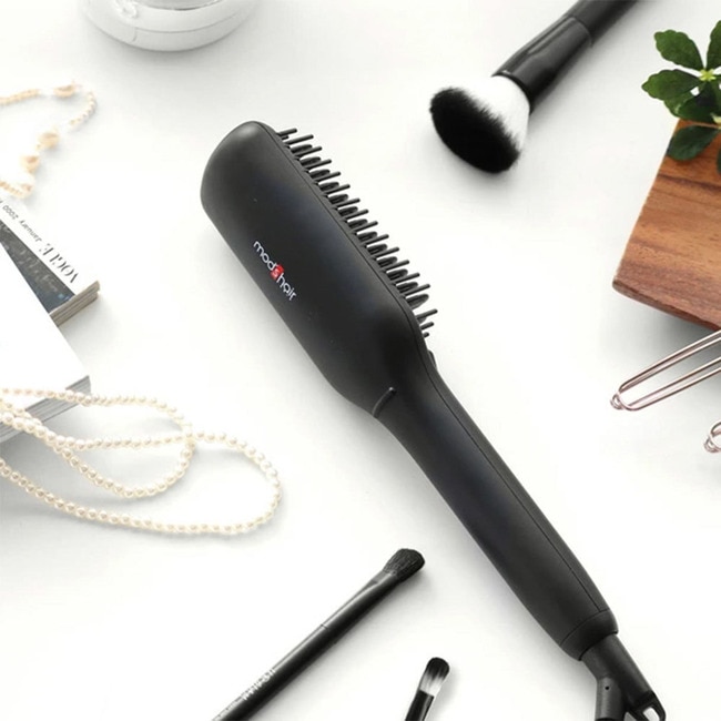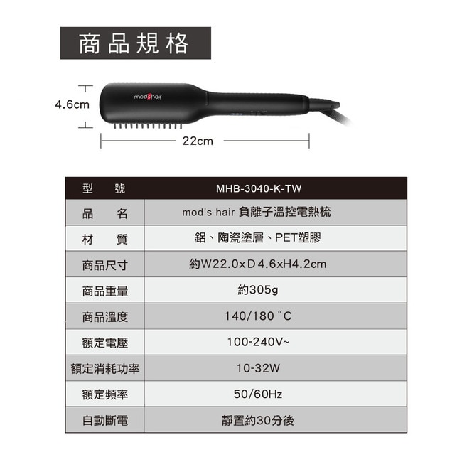 mod's hair 負離子溫控電熱梳,消光烤漆機身,質感升級。防燙加長齒梳設計,防止燙傷,方便梳理,3排加長陶瓷齒梳,交錯排列牢牢抓住髮絲,快速梳理好造型,雙負離子技術,適合容易毛躁的髮絲,撫平毛麟片、順直蓬鬆髮、鎖住髮中水分,使秀髮柔順亮麗,輕巧機身,方便在家、辦公室、旅行使用,二段式溫度控制,適合各種髮質使用。