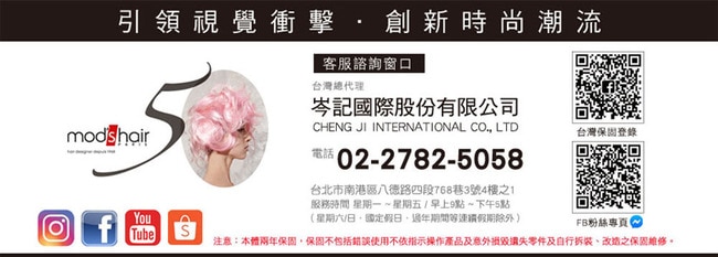 4.產品若已過保固時效,請致電洽詢mod's hair代理商岑記國際股份有限公司或是上Facebook粉絲專頁【mod's hair美髮造型器-Taiwan】,詢問維修詳情。