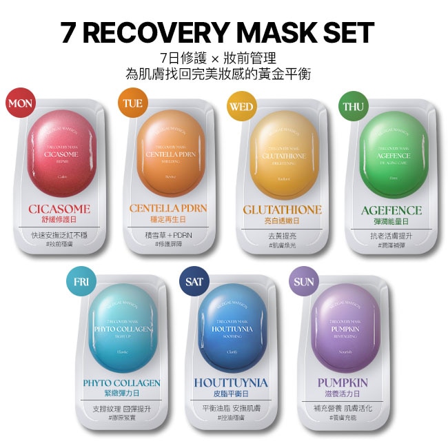 | 產品主要資訊 (產品重點) | [卡粉脫屑救急對策] •連續7天依肌膚節奏對應修護重點 • 7款機能分工修護輕鬆舒緩、亮白、彈力、穩膚 • 天絲材質高服貼 × 精華吸收力1.5倍妝前快速見效 (MON) 舒緩修護日快速安撫泛紅不穩 (TUE) 修護再生日積雪草.PDRN修護屏障 (WED) 亮白透嫩日去黃提亮肌膚煥光 (THU) 彈潤能量日抗老活膚潤澤補彈 (FRI) 緊緻彈力日支撐紋理回彈提升 (SAT) 皮脂平衡日平衡油脂安撫肌膚 (SUN) 滋養活力日補充營養肌膚活化 |