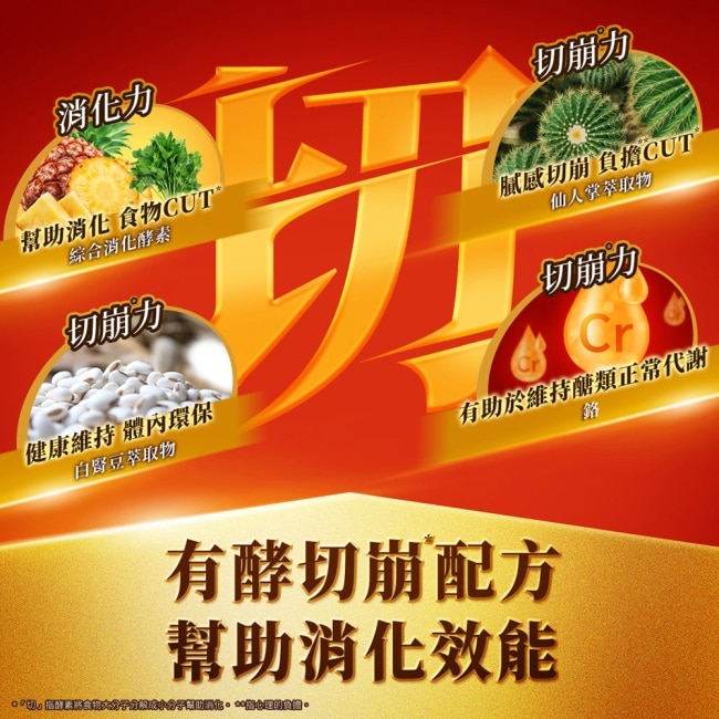 食品添加物香料、鳳梨酵素(麥芽糊精、鳳梨酵素)、植物複合酵素((麥芽糊精、酵素製劑(澱粉分解酵素、蛋白分解酵素、脂肪分解酵素、乳糖分解酵素、纖維分解酵素))、二氧化矽、複方木瓜酵素(葡萄糖、木瓜酵素)、磷酸鎂、葡萄糖酸鋅、磷酸鈣、蔗糖素、吡啶甲酸鉻。