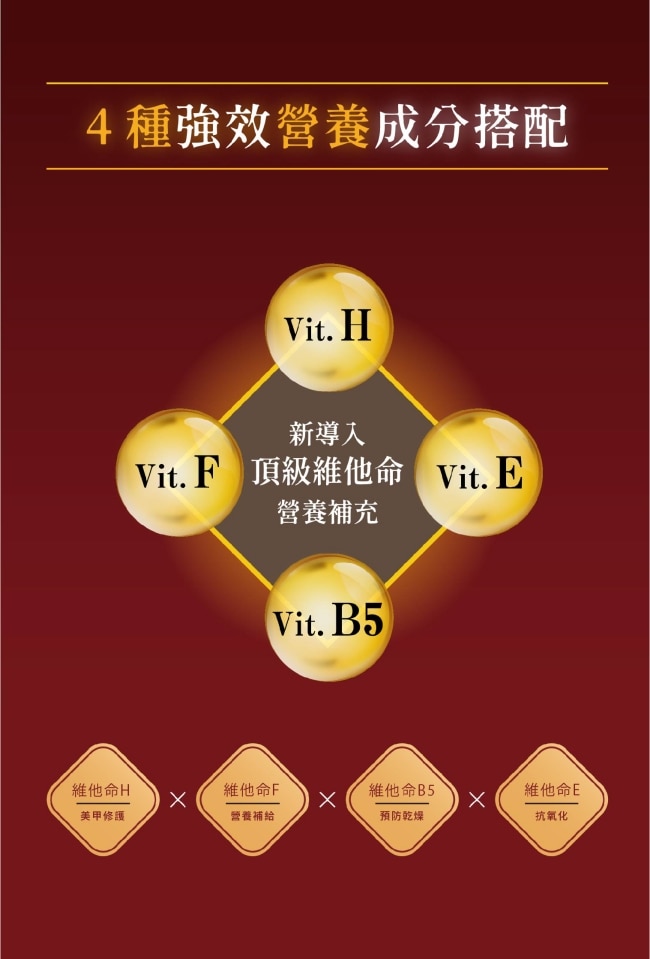 -新導入4種頂級維他命營養補充維他命H美甲修護、維他命F營養補給、維他命B5預防乾燥、維他命E抗氧化。