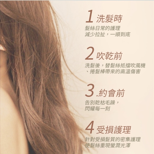 適用於吹整前做基礎潤澤也可在出門前少量補擦於髮尾使髮絲更服貼順滑。