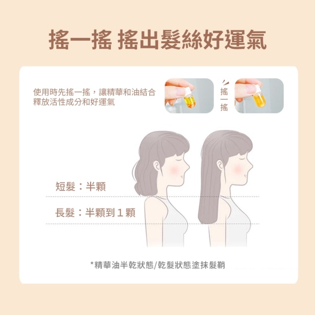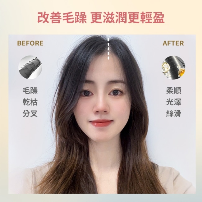 若為乾髮也可少量補擦於髮尾使髮絲呈現更柔順與亮澤感。