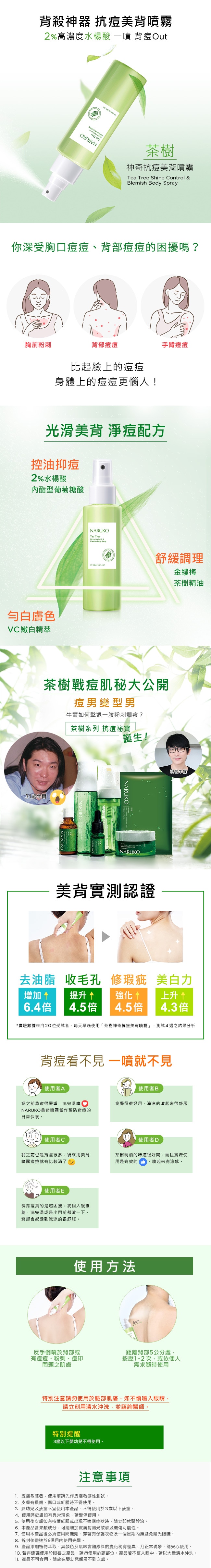 使用方法反手倒噴於背部、有痘痘、粉刺、痘印問題之肌膚,距離背部5公分處,按壓1~2次,或依個人需求隨時使用。特別注意請勿使用於臉部肌膚,如不慎噴入眼睛,請立刻用清水沖洗,並諮詢醫師。