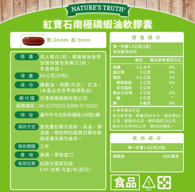 | 製造日期 | 瓶身標示為有效日期 EXP-效期 月底/年(西元) / 保存期限3年 |