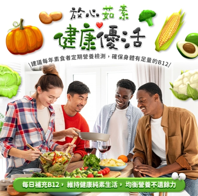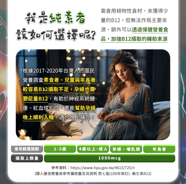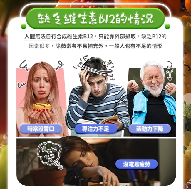 人體無法自行合成維生素B12、只能靠外部攝取、缺乏B12的因素很多、除茹素者不易補充外、一般人也有不足的情形