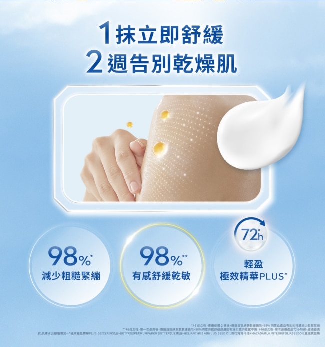 實驗證實98%一抹有感舒緩肌膚因乾燥引起的敏感不適與粗糙膚況
