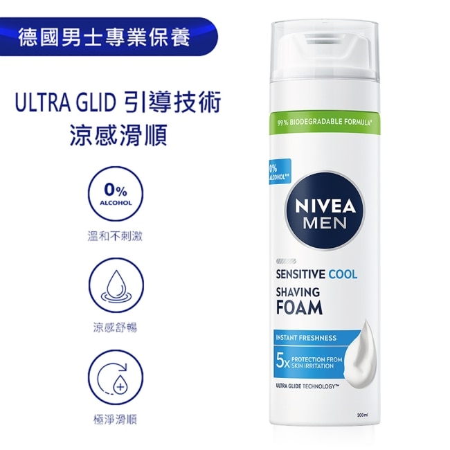 妮維雅男士全新推出極淨酷涼刮鬍泡—無添加酒精新配方,其ULTRA GLIDE引導科技,添加清新涼感因子及洋甘菊萃取、 金縷梅萃取及維生素E等多種肌膚滋養修護成分,能幫助
