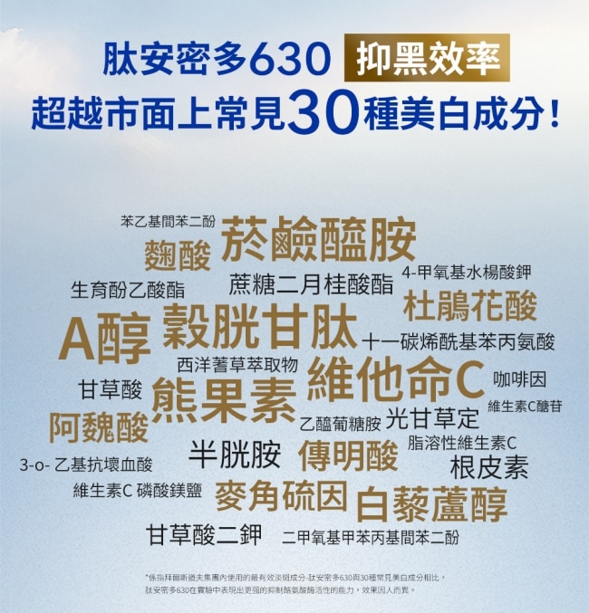 註6 酪胺酸酶受日照或壓力等會刺激黑色素生成從源頭抑制酪胺酸酶活性才是美白淡斑關鍵之一妮維雅經多年研究以人類酪胺酸酶進行抑制黑色素實測從上萬種成分中篩選出第630個真正抑制人體酪胺酸酶的美白淡斑成分─LUMINOUS 630®