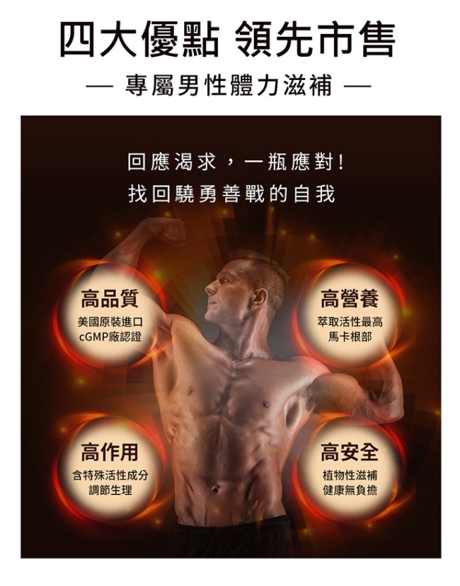 生長於祕魯安地斯山本產品採用高科技萃取生產Maca包含蛋白質、脂質、醣類(碳水化合物)、維生素、礦物質等供應人體基本需求的五大營養素。另外還有胡蘿素、生物鹼、花菁坩、皂角坩、類帖烯、糊精等所謂的活性成分特別是人體中所須的18種必需胺基酸等也都均衡的包含在內是現代男性健康維持活力旺盛的絕佳補給品。