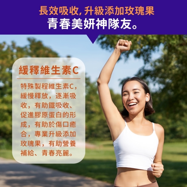 | 商品簡述 | 獨特緩釋配方 1000mg 維他命C促進膠原蛋白形成 升級添加玫瑰果 有助養顏美容 全素 清真認證 |