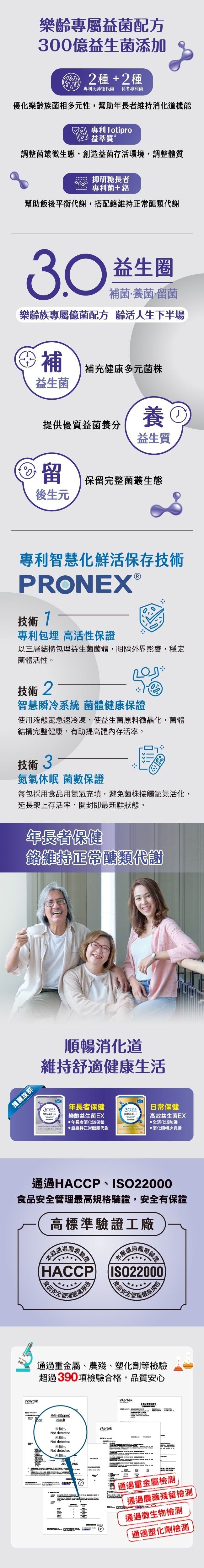 產品簡述: 3.0益生圈新世代保健概念 - 補菌、養菌、留菌體內環保再進化開啟億菌保健新時代。針對樂齡族設計的4種專利菌種搭配鉻維持醣類正常代謝。