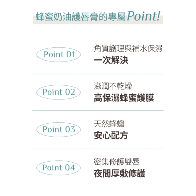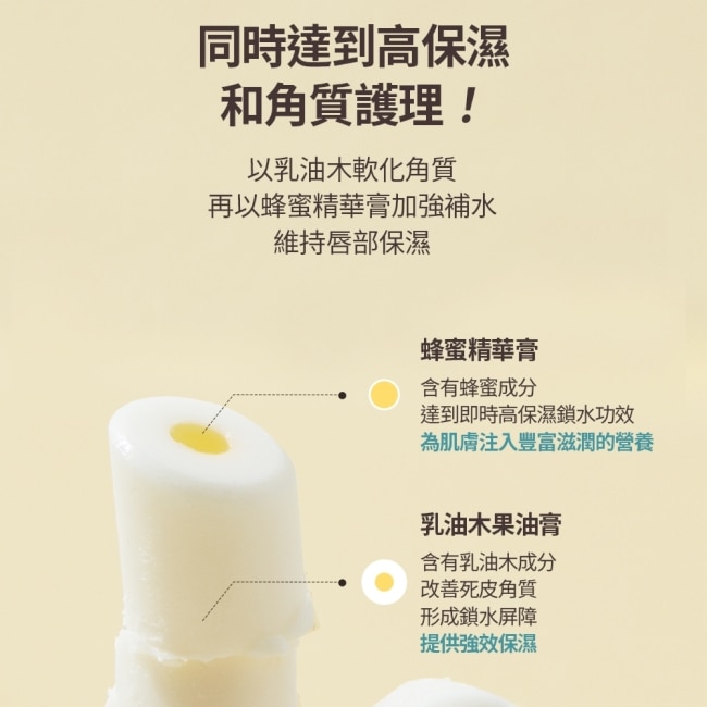 ‧以乳油木軟化角質再以蜂蜜精華膏加強補水