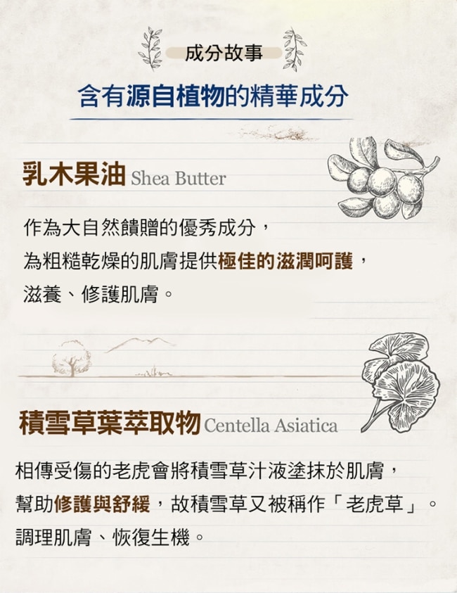 - 含乳木果油為粗糙乾燥的肌膚提供滋潤呵護。