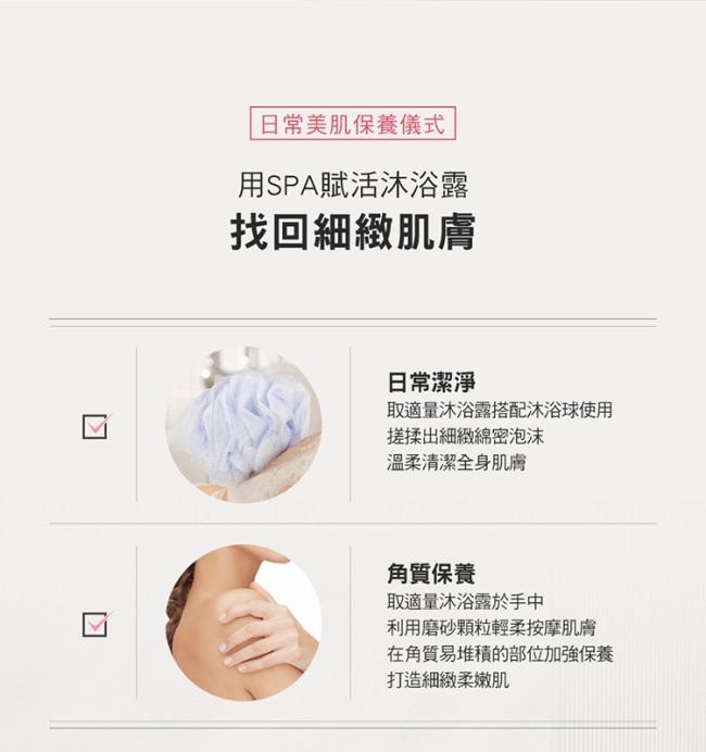 | 商品簡述 | 打造透亮嫩白肌,兼顧高質感香氛與去角質機能的沐浴露 在家就能有SPA級的享受及保養 |