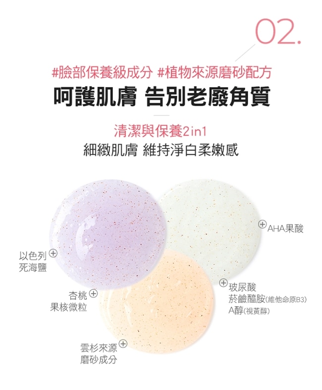 死海鹽及杏桃果核微粒等磨砂成分,可天天使用,在自家沐浴即可做身體保養,細緻肌膚。