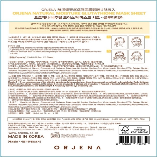 | 中文品名 | ORJENA雅潔娜天然保濕面膜穀胱甘肽五入 |
