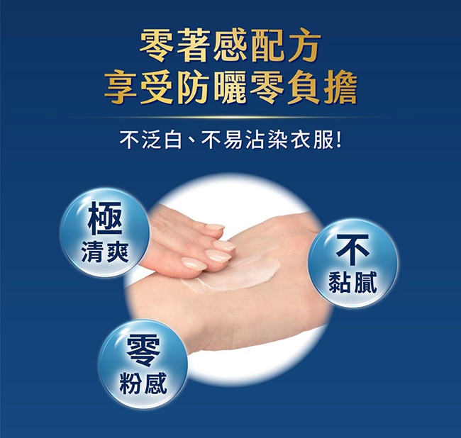 極清爽、零黏膩、零粉感精華液般瞬間吸收且不泛白、不易沾染衣服享受防曬零負擔