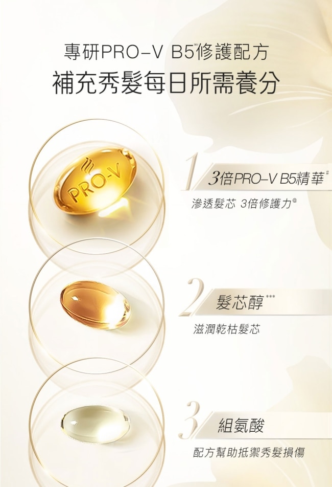 特別添加3倍PRO-V維他命原B5配方針對多種秀髮損傷問題一擊修護累積損傷+打造柔順強韌秀髮。