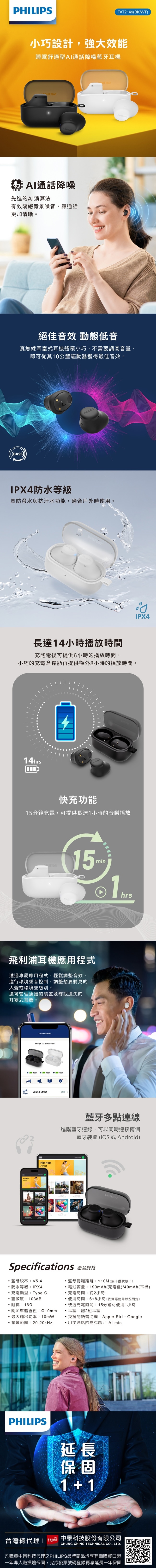 PHILIPS 睡眠舒適型AI通話降噪藍牙耳機-TAT2149