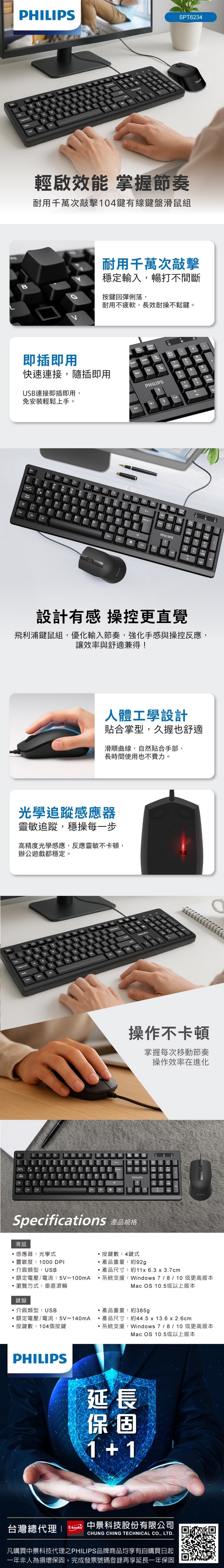 PHILIPS 104鍵有線鍵盤滑鼠組-SPT6234