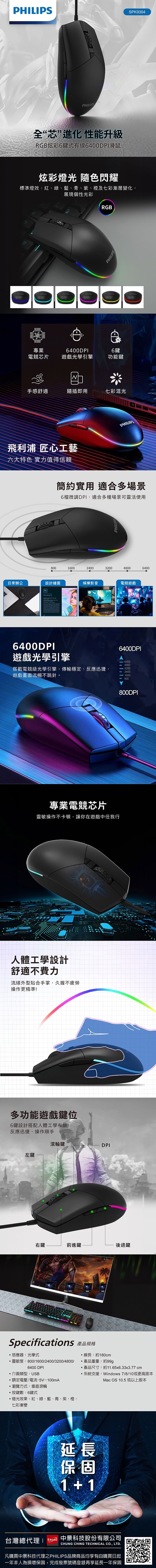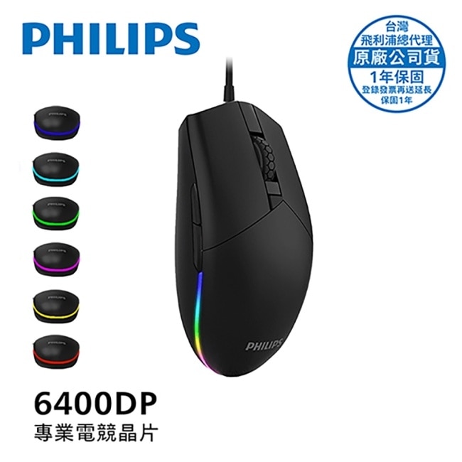 PHILIPS RGB炫彩6鍵式有線6400DPI滑鼠-SPK9304