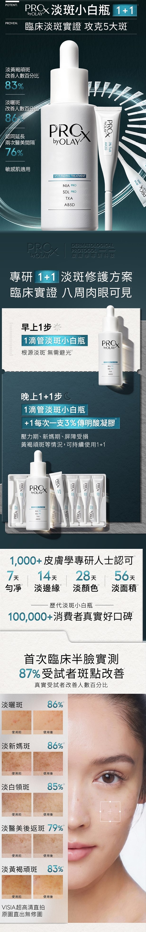 Step 1 PRO X by OLAY 淡斑小白瓶,皮膚學專研科技,菸鹼醯胺PRO2,直擊黑色素母體,根源淡斑3色淡林PRO4+傳明酸,更強穩住黑色素母體。臨床半臉儀器實測,87.1%受試者斑點改善5,7天勻淨6,2周淡斑邊緣7,4周淡斑顏色8,8周淡斑面積8。改善色斑、色素沉澱、膚色不均等黑色素問題,敏感肌適用。