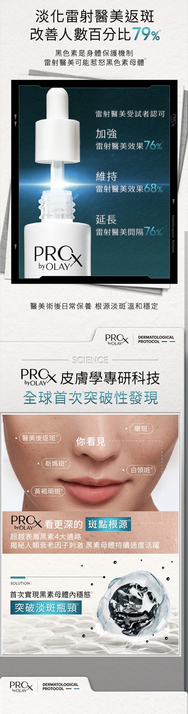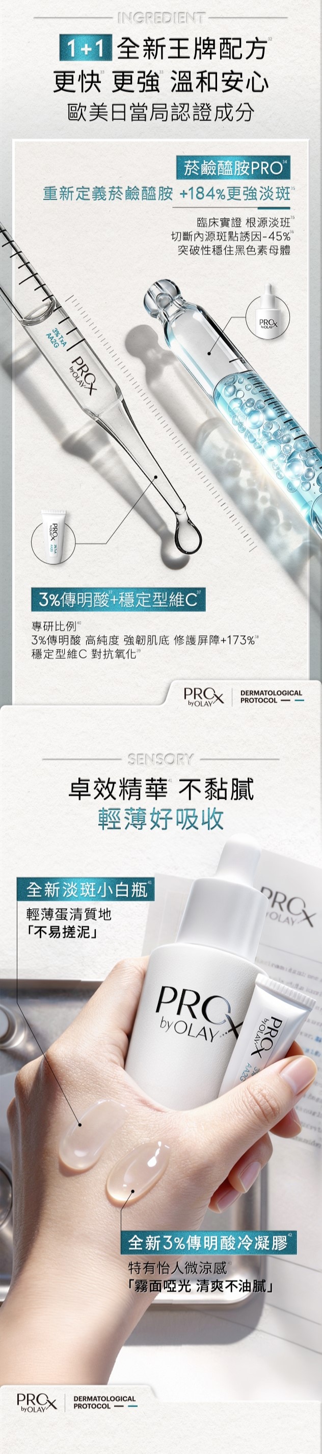 1PRO X BY OLAY專研淡斑淨白精華液、PRO X BY OLAY專研傳明酸穩修冷凝膠的產品組合。其中PRO X BY OLAY專研淡斑淨白精華液提供淡斑功效,PRO X BY OLAY專研傳明酸穩修冷凝膠提供修護功效。首創指品牌內