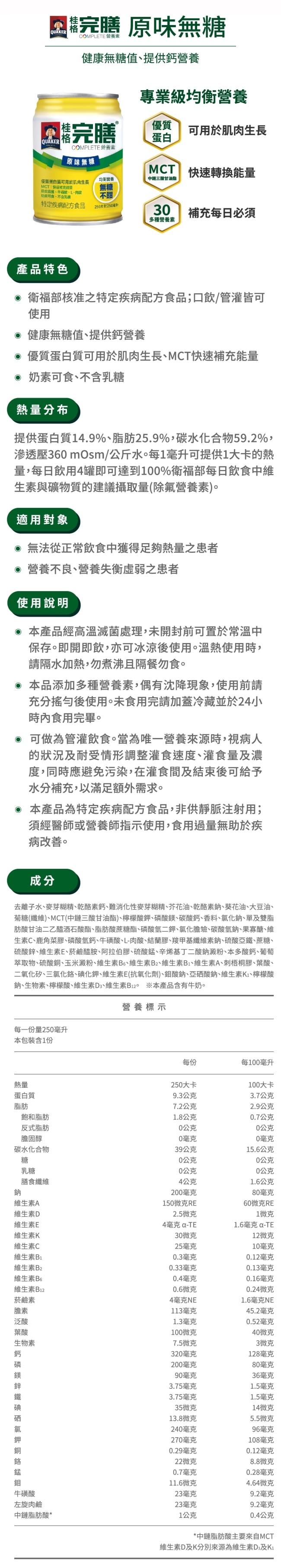 本產品為特定疾病配方食品,非供靜脈注射用,亦不適合一般人食用請依照醫師或營養師指示使用,食用過量無助於疾病改善。