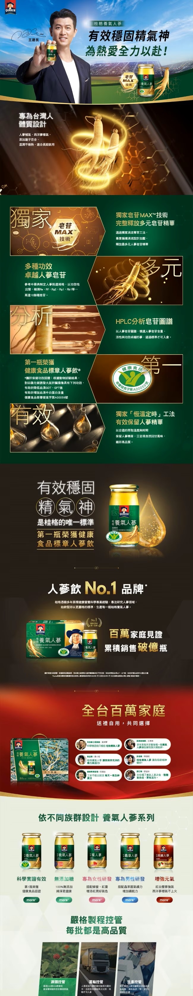 桂格養氣人蔘透過獨門工法打造真正有效的人蔘飲超過 18 年以上人蔘飲領導品牌為百萬個台灣家庭補充元氣精研人蔘領域的桂格以有效為唯一標準調配最適合台灣人需求的人蔘飲配方。桂格養氣人蔘不但嚴選來自北緯41度以北契作蔘田的人蔘以HPLC分析皂苷圖譜慎選人蔘皂苷含量、活性與功效卓越的人蔘通過標準才可入倉。專為台灣人體質設計特別設計結合白蔘、西洋蔘的雙蔘配方更添加蓮子、百合使配方溫潤獨家渦流全釋菁萃工法完整釋放人蔘皂苷菁華是第一瓶榮獲健康食品認證人蔘飲有效穩固精氣神是桂格的唯一標準。