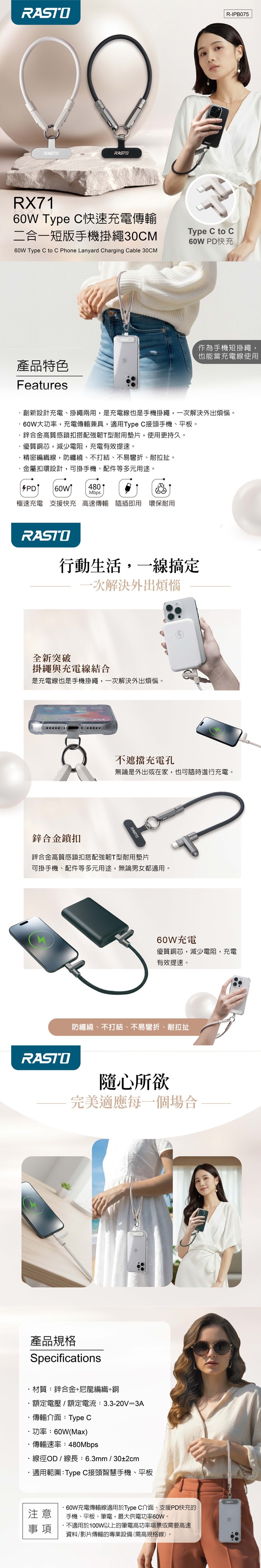 RASTO RX71 60W Type C快速充電傳輸二合一短版手機掛繩30CM