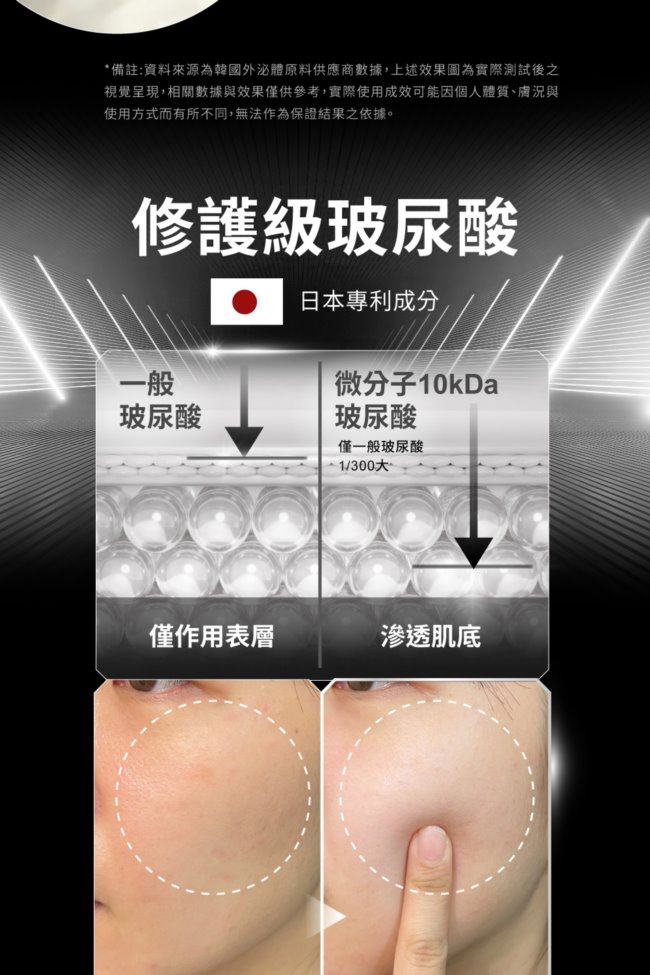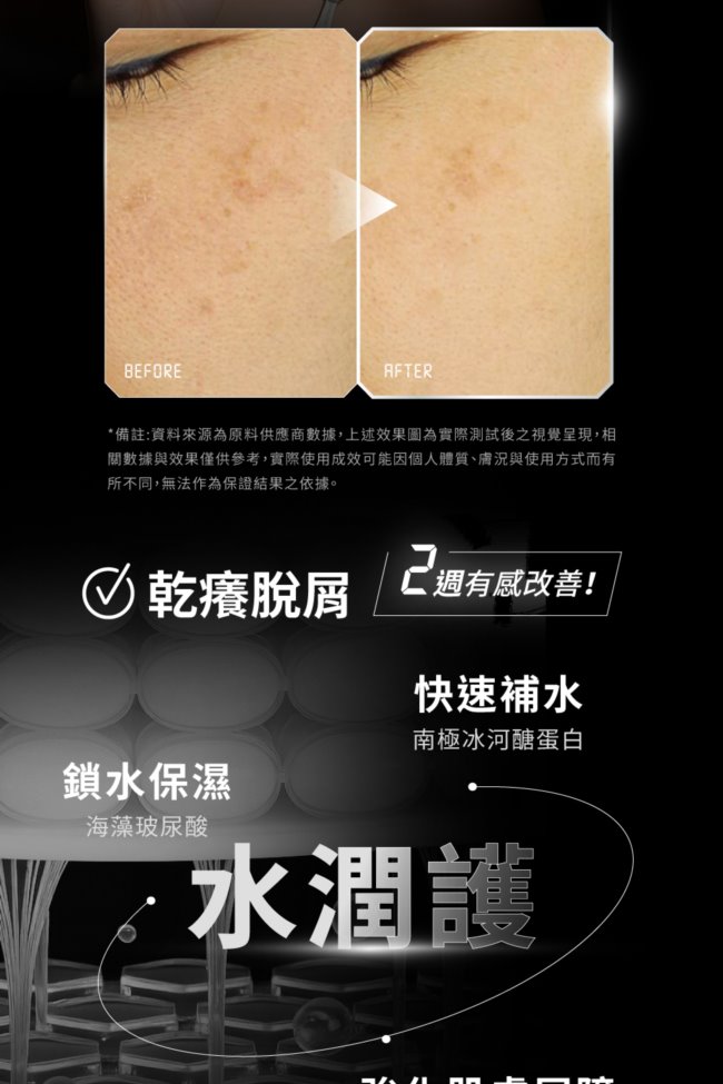 | 商品簡述 | 修護級玻尿酸 滲透肌底、水潤彈嫩;南極冰河醣蛋白 細緻撫平歲月痕跡 |