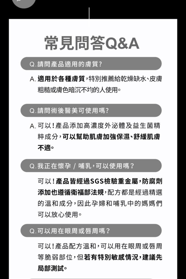 A:可以!產品添加高濃度外泌體及益生菌精粹成分可以幫助肌膚加強保濕、舒緩肌膚不適。