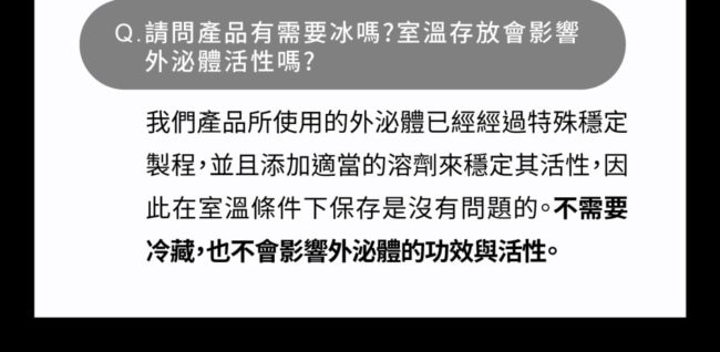 A:我們產品所使用的外泌體已經過特殊穩定製程並且添加適當的溶劑來穩定其活性因此在室溫條件下保存是沒有問題的不需要冷藏也不會影響外泌體的功效與活性。
