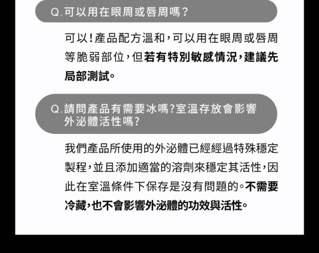 A:我們產品所使用的外泌體已經過特殊穩定製程並且添加適當的溶劑來穩定其活性因此在室溫條件下保存是沒有問題的不需要冷藏也不會影響外泌體的功效與活性。
