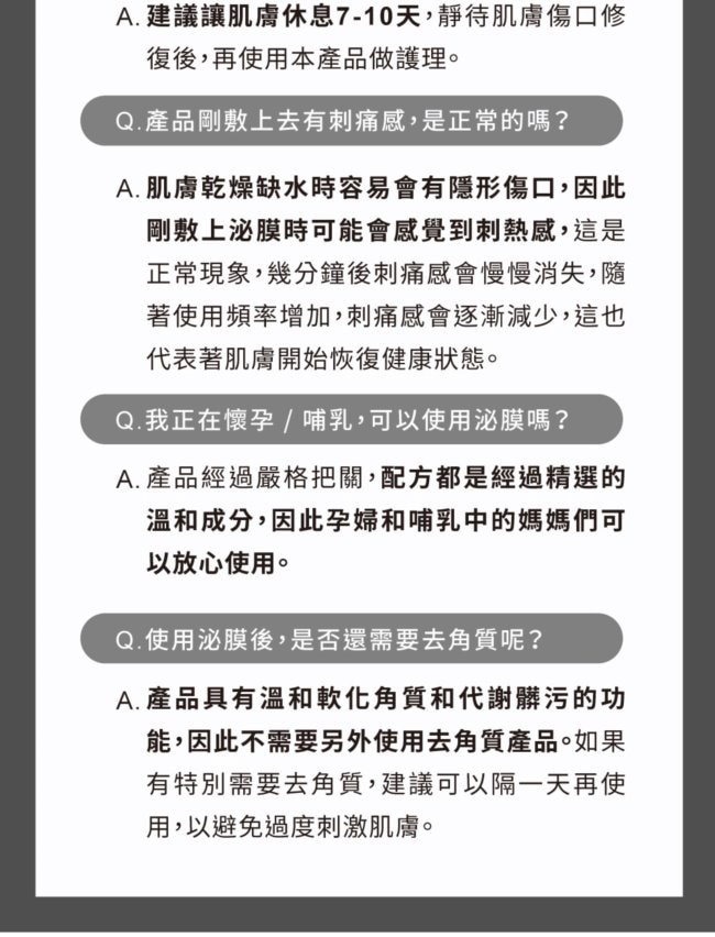 A:肌膚乾燥缺水時容易會有隱形傷口因此剛敷上泌膜時可能會感覺到刺熱感這是正常現象幾分鐘後刺痛感會慢慢消失隨著使用頻率增加刺痛感會逐漸減少這也代表著肌膚開始恢復健康狀態.