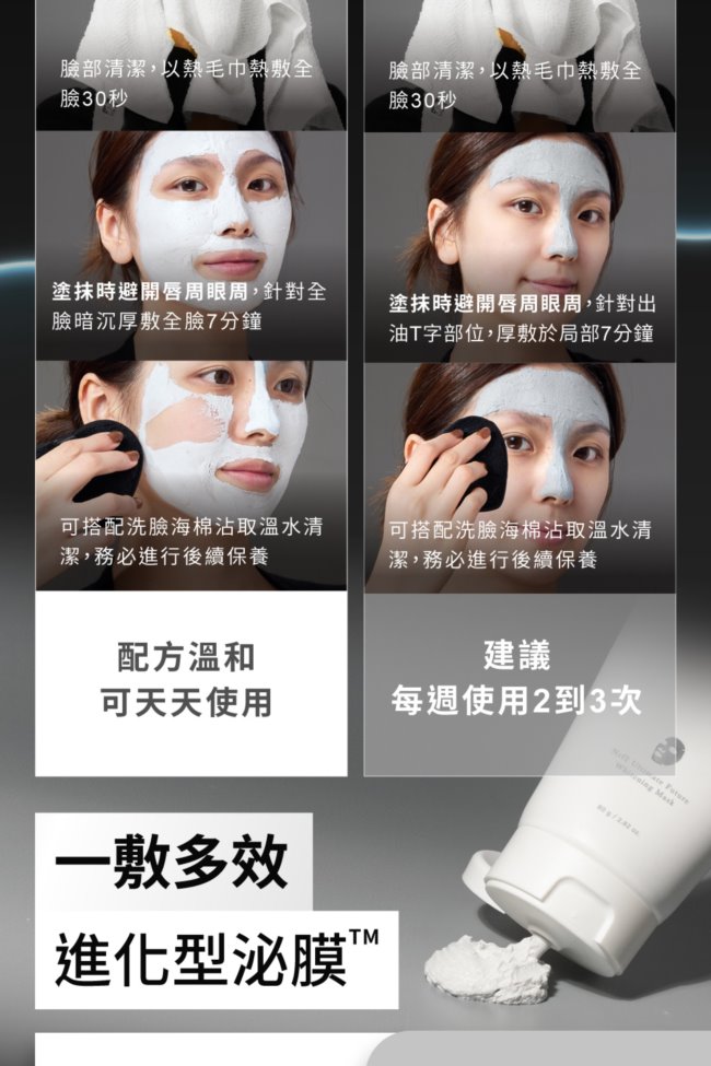 步驟二:取適量泌膜搭配矽膠軟刷美白泌膜可針對全臉暗沉困擾處;控油泌膜可針對T字部位易出油處以看不到肌膚顏色為主塗抹均勻厚敷7分鐘(請避開唇周和眼周)