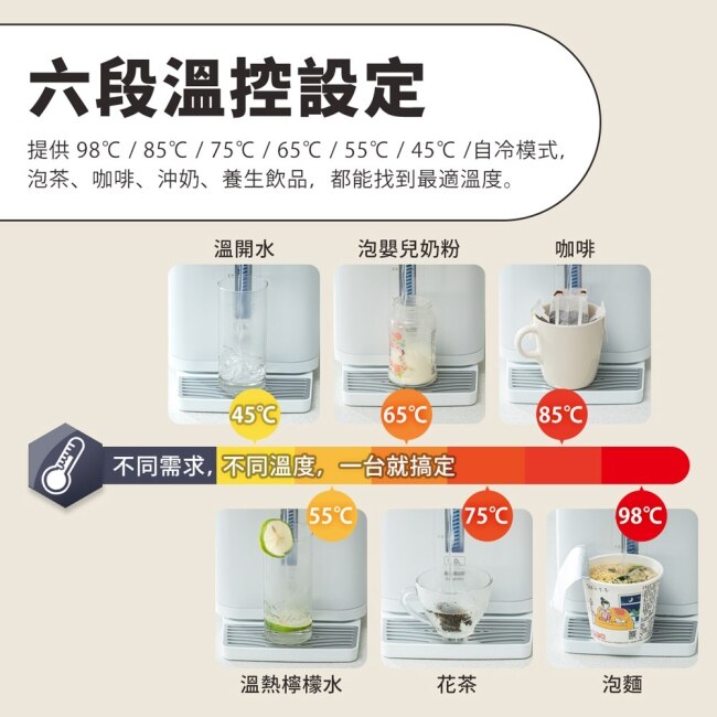 六段可調溫度(45/55/65/75/85/98度)