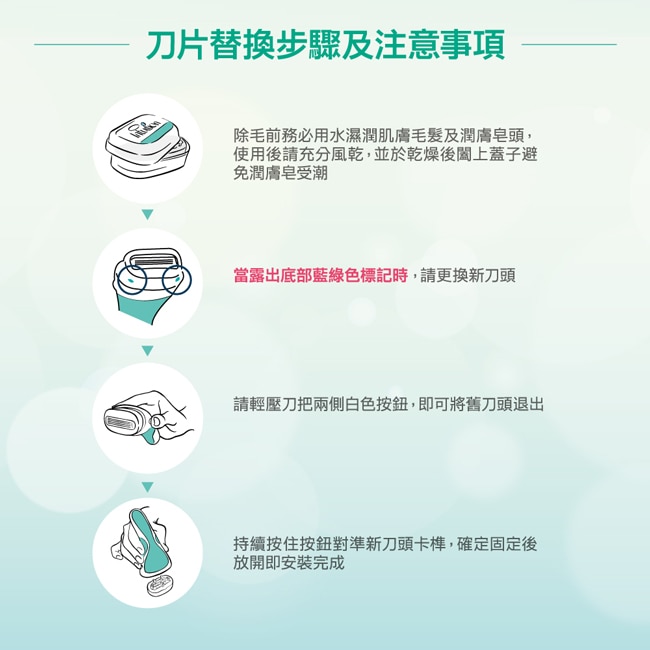 商品介紹超薄4刀片除毛刀含天然蘆薈及維他命E潤膚皂讓除毛更順暢同時滋潤肌膚具環保概念