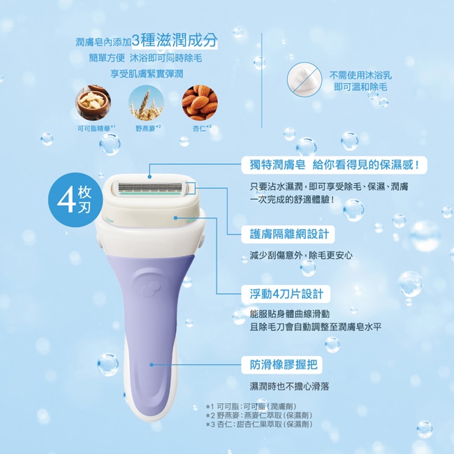 浮動4刀片設計 能服貼身體曲線滑動且除毛刀會自動調整至與潤膚皂水平