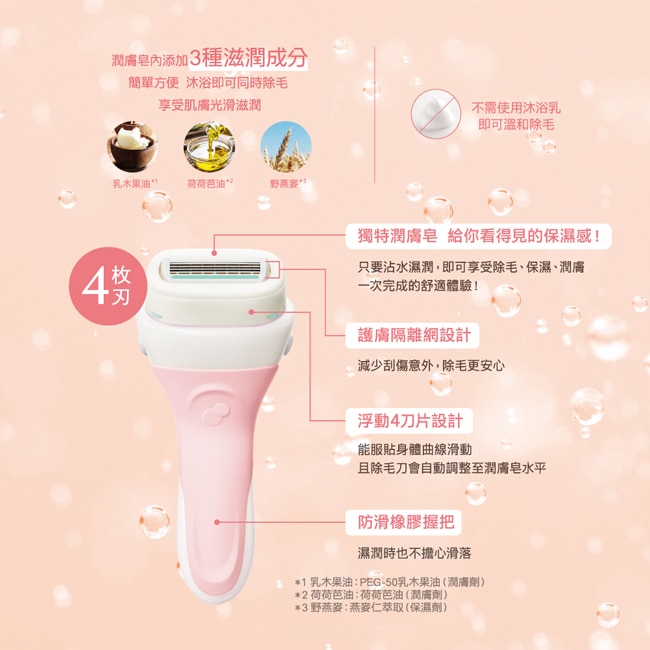 浮動4刀片設計 能服貼身體曲線滑動且除毛刀會自動調整至與潤膚皂水平