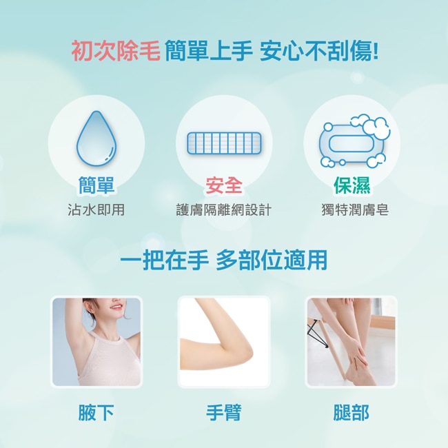 只要沾水濕潤即可享受除毛、保濕、潤膚一次完成的舒適體驗