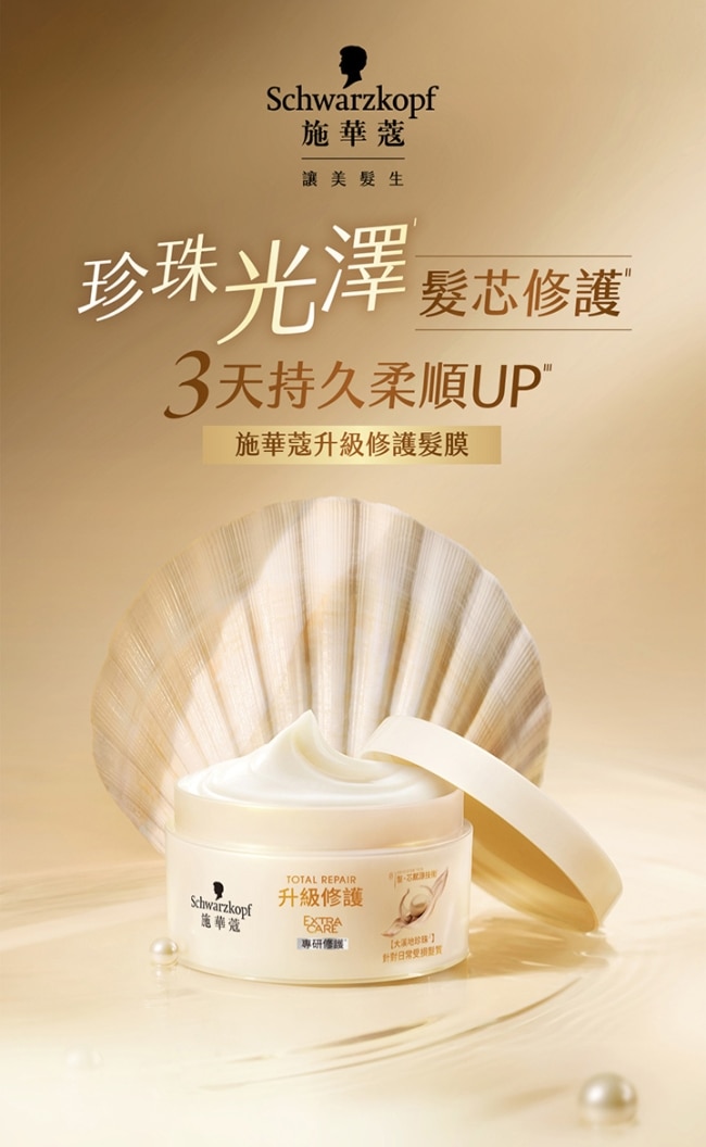 施華蔻新上市升級修護髮膜, 運用新一代髮芯賦源技術, 由內而外修護髮芯皮質層, 填補髮芯空洞, 使髮絲擁有珍珠光澤。