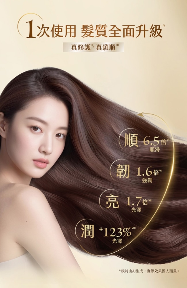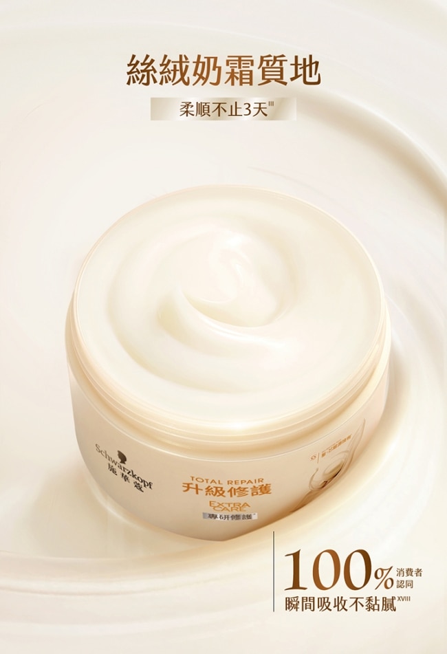使用後,100%消費者認同可以瞬間吸收不黏膩。搭配升級修護洗髮露及護髮素使用,洗、潤、養一步到位。