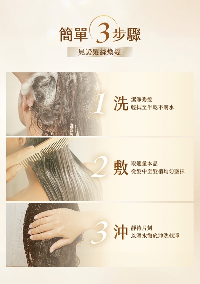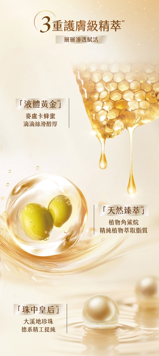 添加3重護膚級精萃,包括麥盧卡蜂蜜、天然臻萃植物角鯊烷、提煉大溪地珍珠精華,層層滲透賦活髮芯。