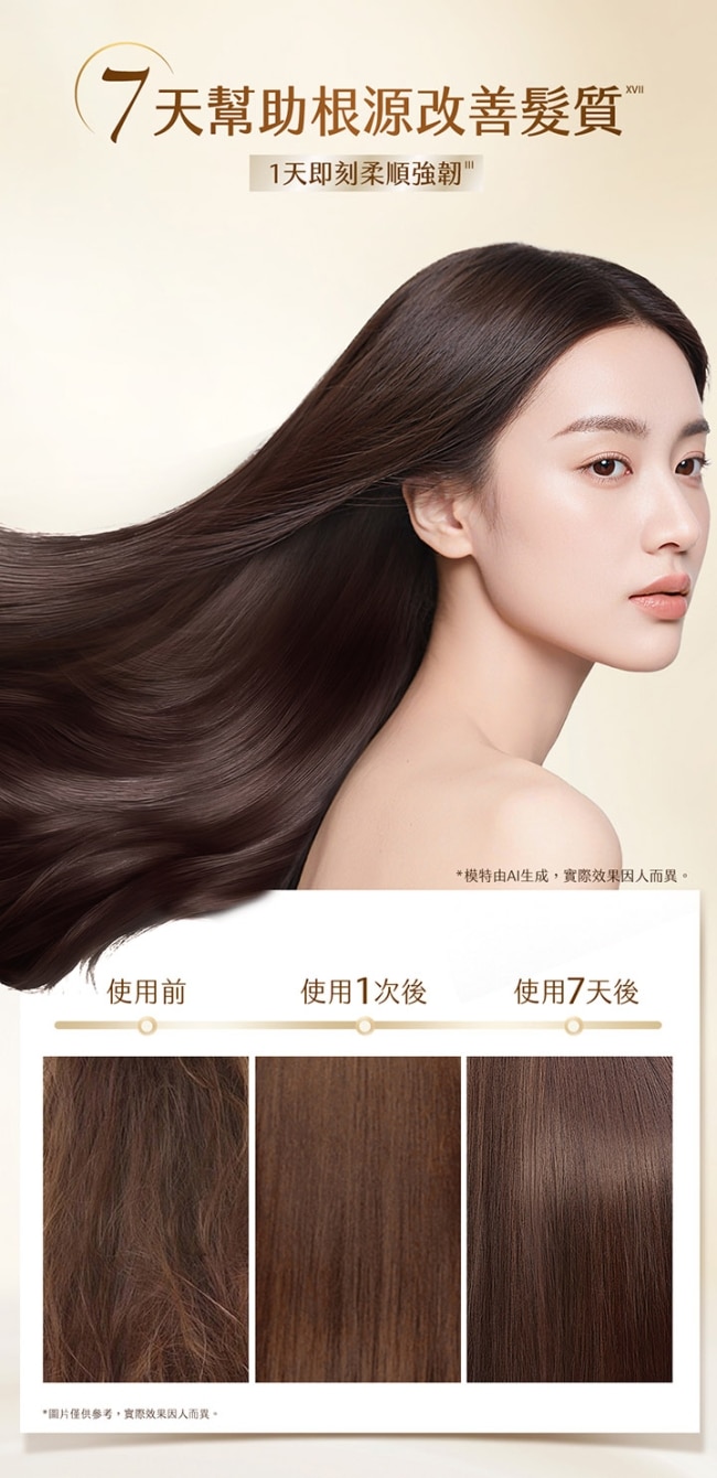 1次使用即可讓髮質全面升級、柔順強韌,3天持久柔順,7天幫助根源改善髮質。