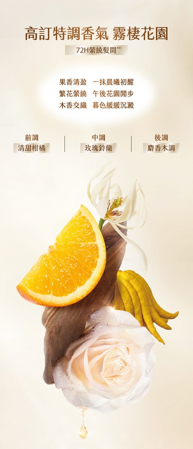 輕奢特調香氣設計,前調為清甜柑橘,中調為玫瑰鈴蘭,後調為麝香木調,提供使用者多層次的香氣體驗,且長達72小時縈燒髮間。