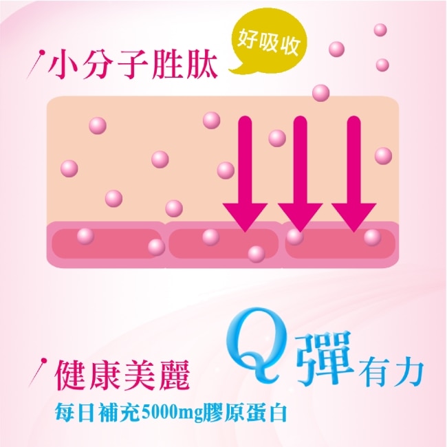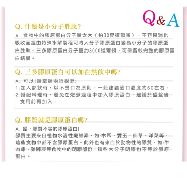 本品所含膠原蛋白為小分子化胜肽平均分子量約3000道爾頓適合人體消化吸收。